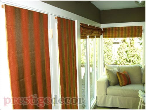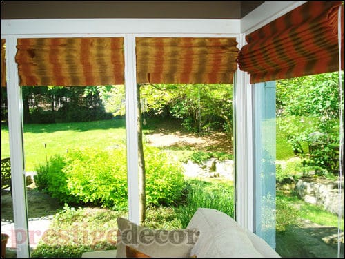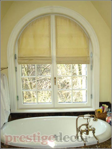 Very unique roman blinds – Austrian valance made with taffeta fabric is on the top of Austrian roman blinds made with sheer fabric. On the bottom of sheer blinds we add gathered sheer trims.