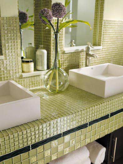 No, it’s not the time for a high-end countertop update, which is why tile is the perfect option here. This budget-friendly project can give the bath or kitchen a refreshing decorating aesthetic and a nice, clean, contemporary look. Just make sure you pick a single style of tile. If you want to add your personal touches, you may want to consider creating a pattern that contrasts with the color of the tiles or add decorative tile inserts.