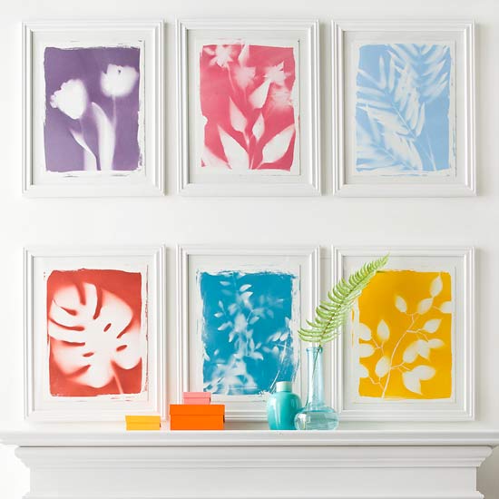 Another great idea to enhance a wall is to create a modern look of botanical prints. Lay back on a black canvas plastic or silk greenery and spray a coat of paint to create a reverse silhouette of the greenery. Then, a special material namely frisket that you can find in the crafts store (model-building section) will help you give the pieces a unique border.