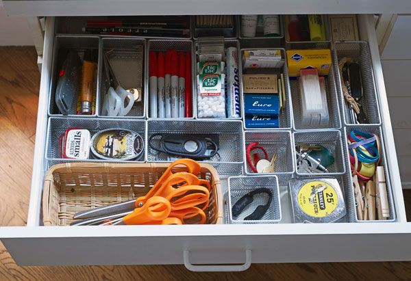 Speaking or organizing stuff around the house to avoid clutter and enhance its look, drawers that hold an incredible jumble of items can be tamed with ridiculously easy DIY solutions. Use clear containers or dividers (you can find some really cheap ones at hardware stores) to group like items. Dividers are usually plastic or wire and can help designate space for practically everything, from underwear and socks in the bedroom to school supplies and crafts in the kitchen.