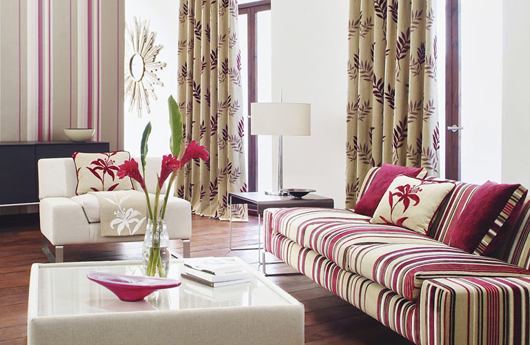 The most popular drapery patterns are tone-on-tone, stripes and geometrical patterns. We also see lots of requests for English Country or French Provincial flower patterns. Most of the time people like to stay on the safe side by choosing more neutral patterns. Bold patterns are almost always added for custom cushions to make a statement in the room.