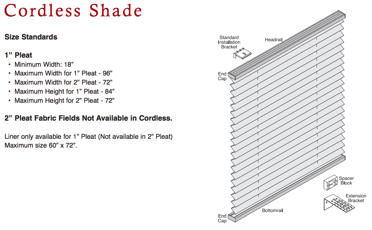 | Cordless shade 1 inch pleat | 18 | 1 inch pleat- 96 2 inch pleat- 72 | |