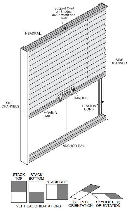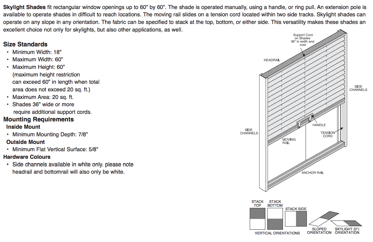 If you are looking for truly a 100% blackout solution than our Skylight Blinds with side channels are the product you have been looking for. Side channels are fitted perfectly to your window frame so that no light can enter when the blinds are down. The maximum dimensions for these blinds are 60 x 60 inches. These blinds are always operated manually using a handle or ring. Extension poles are also available for difficult to reach windows. You have the option to have the fabric stack on the top, bottom or either side. View Size Standards.