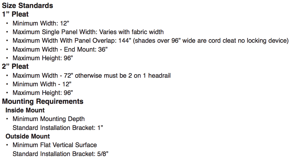 Our pleated shades are available in a variety of styles. In the table below we provide specifications for each type of pleated shades that we carry.