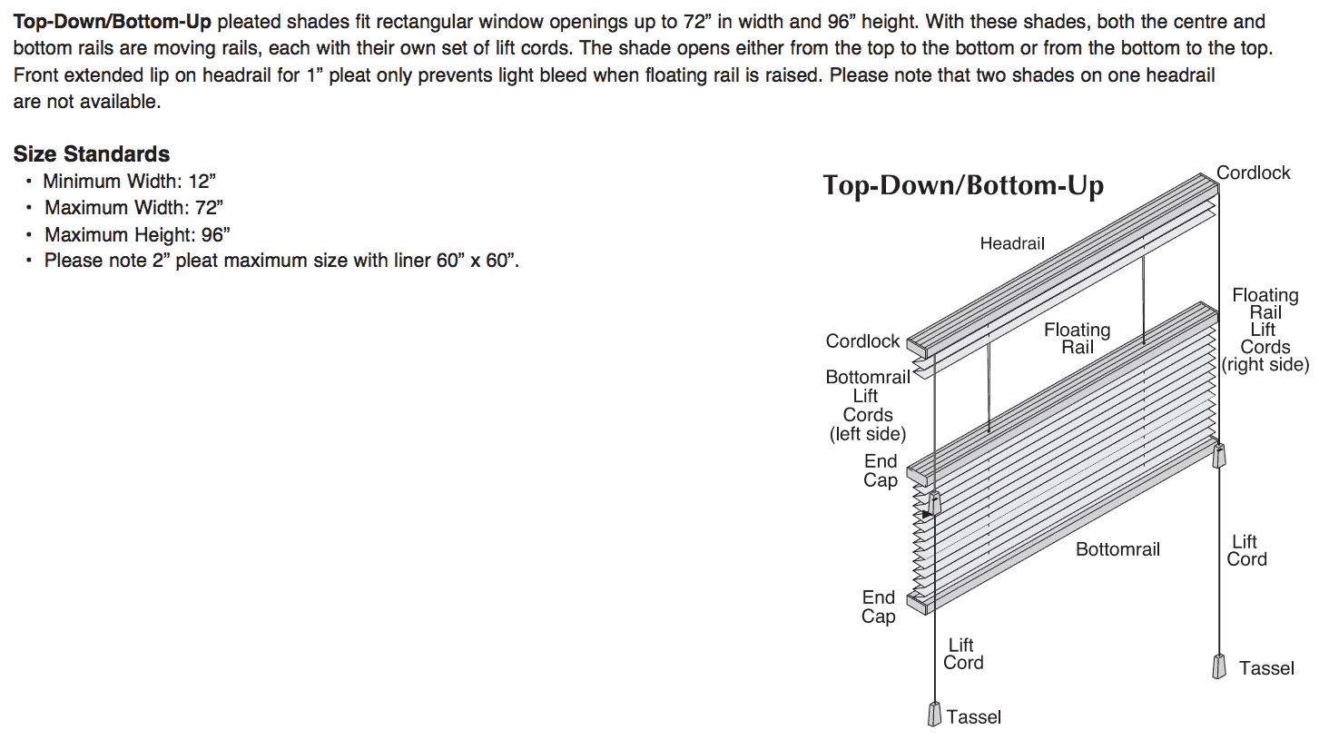 Our Top Down/Bottom Up pleated shades are one of our most popular shades and are ideal for rectangular windows that are up to 96 inches in height and 72 inches in width. The reason our customers love our top down / bottom up shades so much is because they can have complete privacy while allowing sun light to enter simply by opening the top part of the shade while keeping the bottom part closed. View more info and Size Standards.