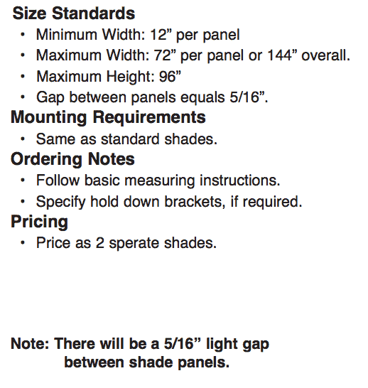 | Twins shades on single headrail | 12 | 72 Per panel | 96 |