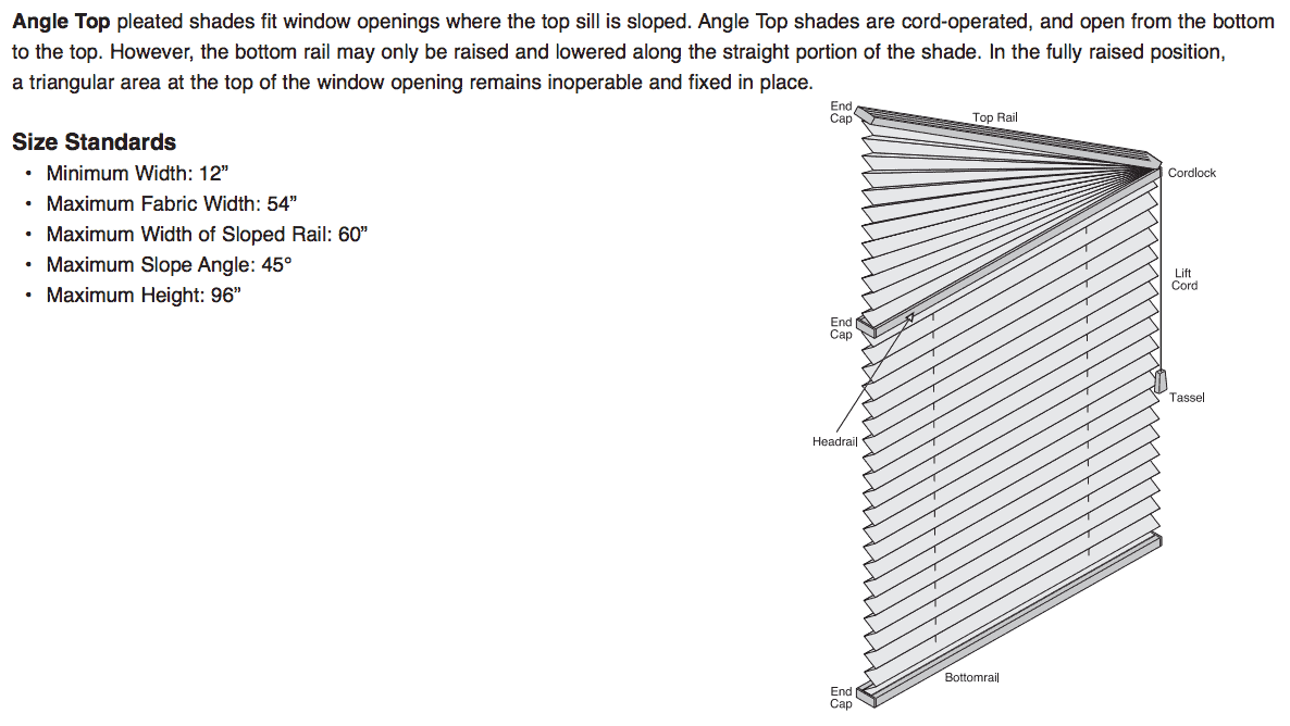 Our Angle Top pleated shades are made for windows that are sloped at the top. These shades are always cord-operated, and open from bottom up. The blind may be raised only to the top of the straight part of the window. The angled area at the top is not operable and remains fixed. View more info and Size Standards.