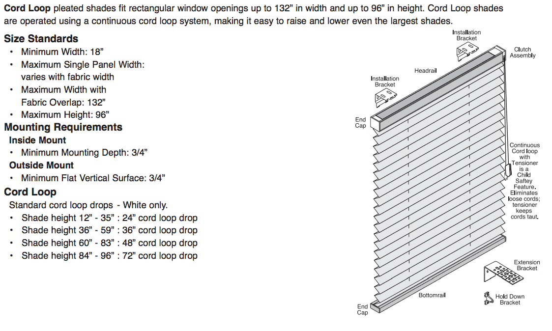 Our Cord Loop pleated shades are ideal for rectangular windows that are up to 96 inches in height. The maximum width is 96 inches. The Cord Loop shades operate on a continuous cord loop technology, which allows for easy lowering and raising of these shades regardless of how large and heavy they are. View more details and Size Standards.