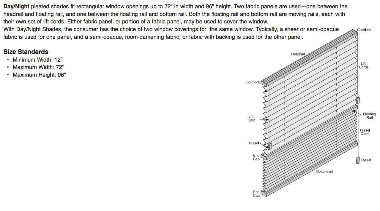 Our Day/Night pleated shades are ideal for windows that are up to 96 inches in height and 72 inches width. These shades are really practical and allow you to have a choice of two window coverings on the same window. Usually, a semi-opaque, room-darkening fabric, or blackout fabric is used for one panel, and a sheer or semi-opaque fabric is used for the other. View more info and Size Standards.