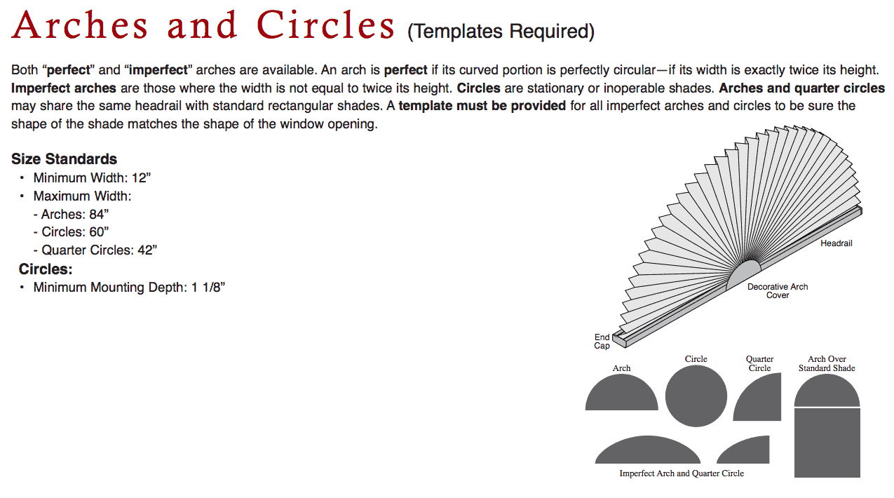 We offer perfectly fitted pleated shades for all types of arched and circular windows. Regardless if your window arches are perfect or imperfect our experts will be able to custom fit our quality blinds/shades perfectly to the shape of your window. A perfect arch is considered perfect if it is perfectly circular where it curves – if the width is precisely 2 times the height. Imperfect arches are those whose width isn’t exactly 2 times the height. Blinds/shades that cover circular windows are always stationary and are not operable. Arched and quarter window shades can share the same headrail with standard rectangular blinds/shades below them. View Size Standards.