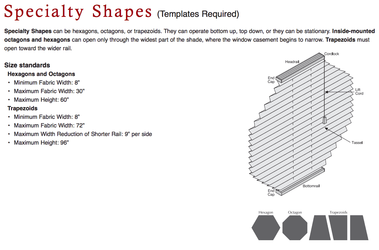 Our pleated shades for specialty shapes are ideal for trapezoids, octagonal, and hexagonal windows. A variety of operational options are available including: bottom-up, top-down and stationary. If you wish to have inside-mounted blinds; they can only be opened and closed through the widest part of the blinds. View Size Standards.