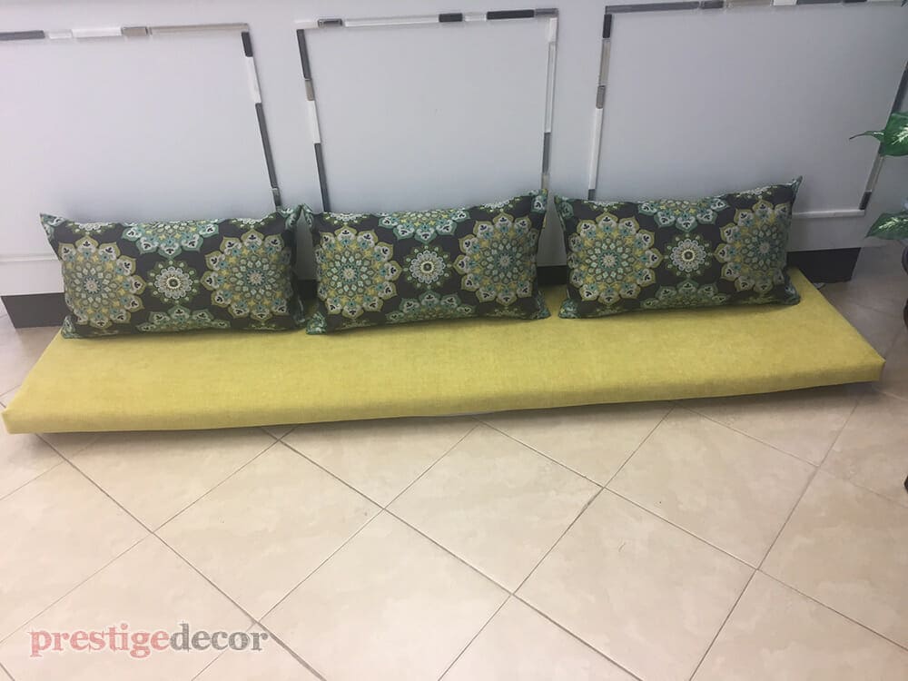 We made this window seat cushion and matching throw cushions for a big kitchen to add colour to a kitchen with white cabinets and light grey walls. This 88″ long window seat in a bright colour and colourful back cushions will make more the kitchen more inviting and relaxing
